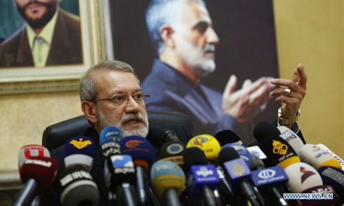 Iran's Speaker of Parliament Ali Larijani addresses a press conference at the Iranian embassy in Lebanon in Beirut, Lebanon, on Feb. 17, 2020. Iran's Speaker of Parliament Ali Larijani said Monday that his country is ready to help Lebanon in all fields amid an absence of support by the international community, local Al Manar TV channel reported. (Photo by Bilal Jawich/Xinhua)
