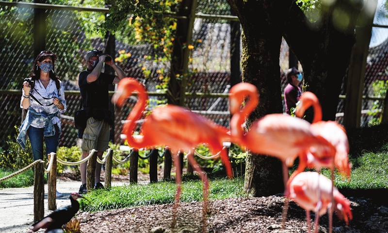 Visitors wearing protective face masks look at flamingos on the reopening day of Pairi Daiza animal park in Brugelette, Brussels on Monday as Belgium eases lockdown measures taken to curb the spread of the COVID-19 pandemic. Photo: AFP