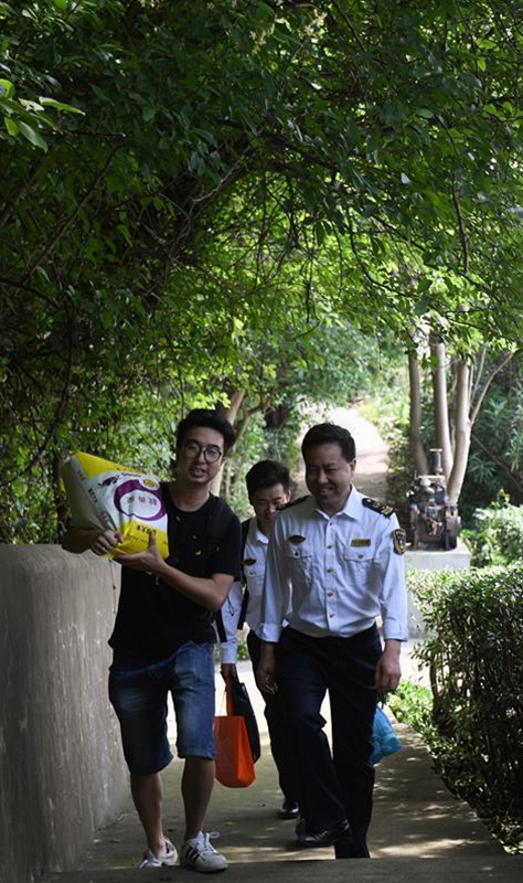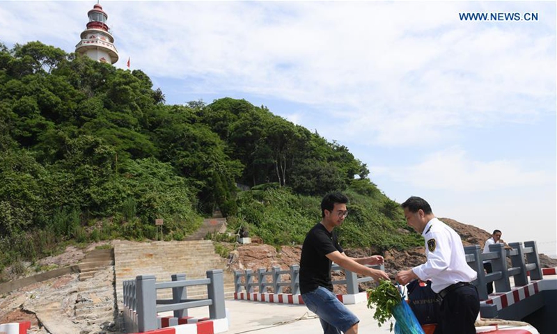 Ye Chaoqun (L), a fifth-generation lighthouse keeper, receives fresh vegetables from his father, Ye Jinghu, who brings daily necessities, on Qiliyu Island in Ningbo, east China's Zhejiang Province on May 20, 2020. Five generations of one family from Ningbo, east China's Zhejiang Province, have served as lighthouse keepers, adopting one family motto that is "keep the light on when you are alive" resolutely. In 1883, Ye Lairong, first lighthouse keeper of the family, started working on Baijie Island. After that, his descendants inherited and devoted themselves to the work. Now, 32-year-old Ye Chaoqun, the family's fifth generation of lighthouse keeper, has been working on Qiliyu Island for seven years and still bears the family motto in mind. (Xinhua/Weng Xinyang)