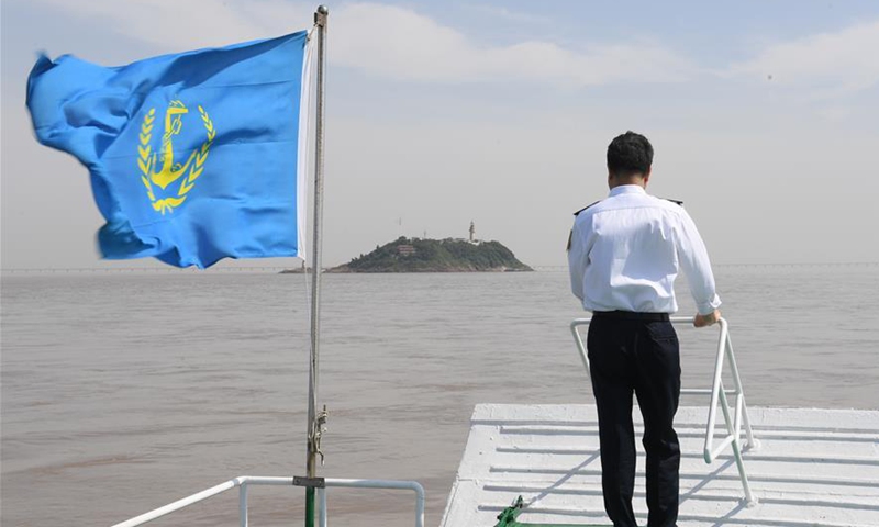 Ye Jinghu, a fourth-generation lighthouse keeper and the father of Ye Chaoqun, stands on a supply boat as it sails to Qiliyu Island where his son works, in Ningbo, east China's Zhejiang Province on May 20, 2020. Five generations of one family from Ningbo, east China's Zhejiang Province, have served as lighthouse keepers, adopting one family motto that is "keep the light on when you are alive" resolutely. In 1883, Ye Lairong, first lighthouse keeper of the family, started working on Baijie Island. After that, his descendants inherited and devoted themselves to the work. Now, 32-year-old Ye Chaoqun, the family's fifth generation of lighthouse keeper, has been working on Qiliyu Island for seven years and still bears the family motto in mind. (Xinhua/Weng Xinyang)