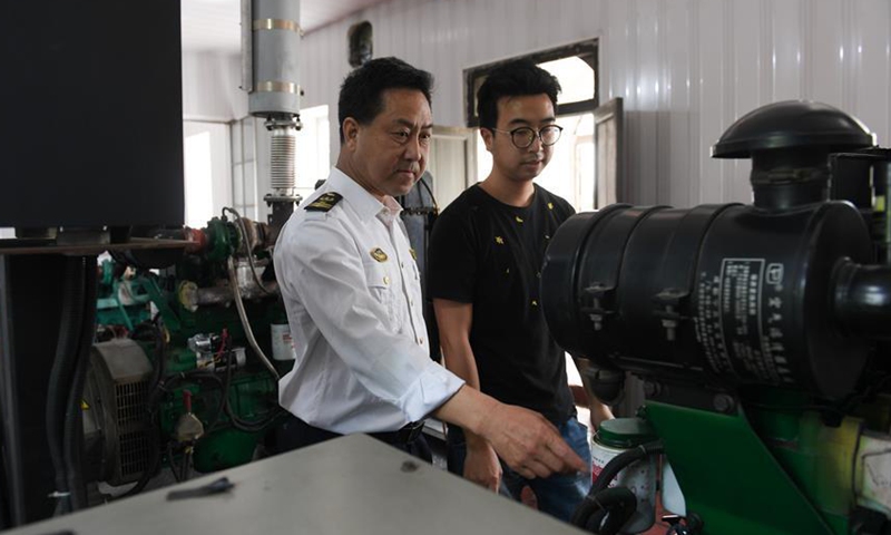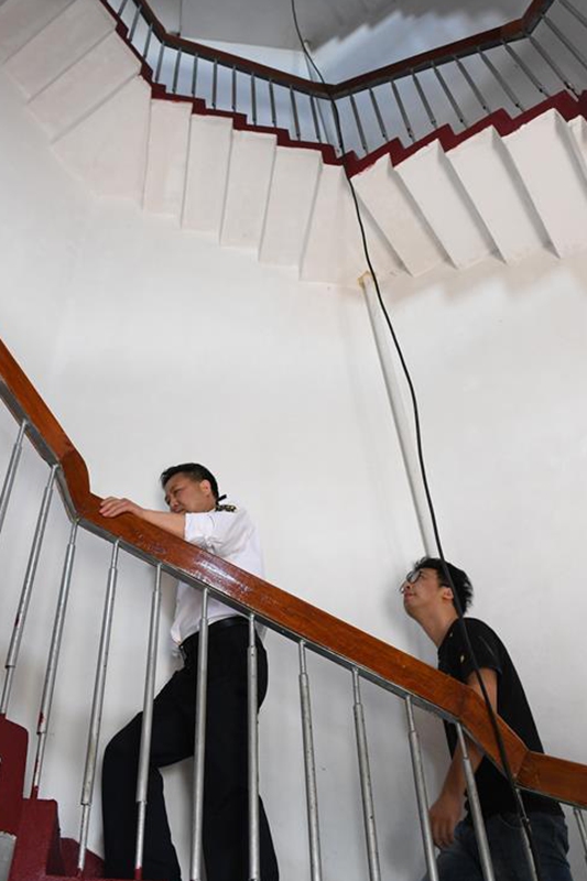Ye Chaoqun (R), a fifth-generation lighthouse keeper, talks to his father about lighthouse equipment operations on Qiliyu Island in Ningbo, east China's Zhejiang Province on May 20, 2020. Five generations of one family from Ningbo, east China's Zhejiang Province, have served as lighthouse keepers, adopting one family motto that is "keep the light on when you are alive" resolutely. In 1883, Ye Lairong, first lighthouse keeper of the family, started working on Baijie Island. After that, his descendants inherited and devoted themselves to the work. Now, 32-year-old Ye Chaoqun, the family's fifth generation of lighthouse keeper, has been working on Qiliyu Island for seven years and still bears the family motto in mind. (Xinhua/Weng Xinyang)