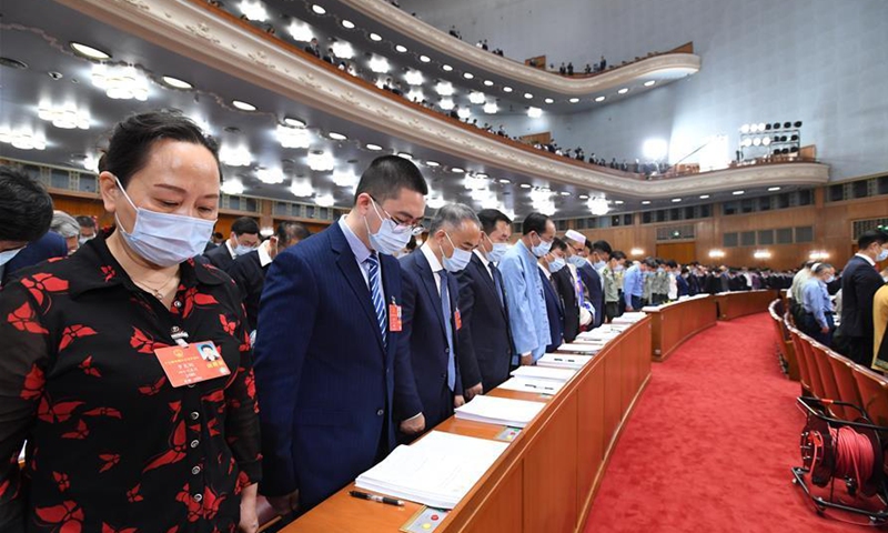 Attendees pay a silent tribute to martyrs who died fighting COVID-19 and compatriots who lost their lives in the epidemic during the opening meeting of the third session of the 13th National People's Congress in Beijing, capital of China, May 22, 2020. (Xinhua/Rao Aimin)