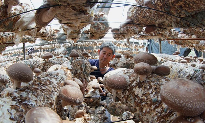 A farmer picks mushroom at a planting base in Louzhangzi Township in Qinglong Manchu Autonomous County, north China's Hebei Province, May 20, 2020. The local government has made great efforts to develop the mushroom planting industry in recent years as a way to boost local people's income and get rid of poverty. (Xinhua/Zhu Xudong)