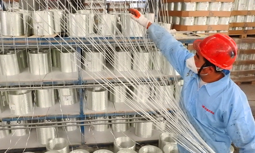 A worker handles glass fiber reinforced plastic on Thursday in a factory in Lianyungang, East China's Jiangsu Province. Since the economy was restarted, the city's manufacturers are producing various glass fiber products, which are exported to countries and regions along the routes of the Belt and Road Initiative (BRI). Photo: cnsphotos