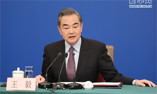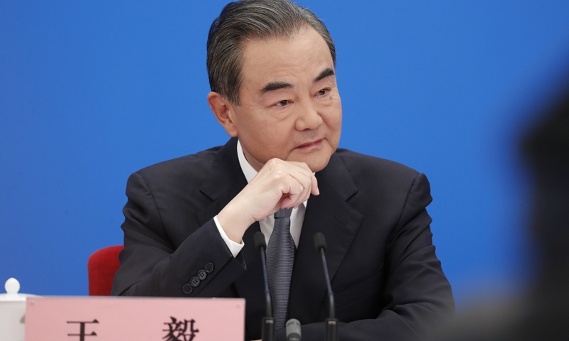 Chinese State Councilor and Foreign Minister Wang Yi attends a press conference on the sidelines of the third session of the 13th National People's Congress (NPC) on Sunday. This year's press conferences are being held by video in light of the coronavirus. Photo: cnsphoto