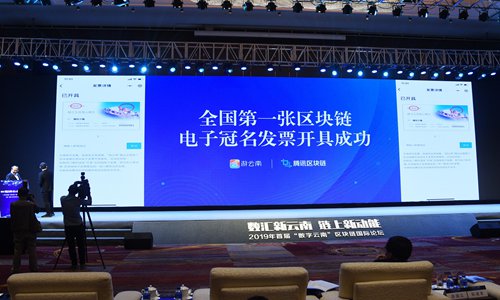 The first blockchain-based invoice for tourist attractions in Southwest China's Yunnan Province is issued at an international blockchain forum in July. Photo: VCG