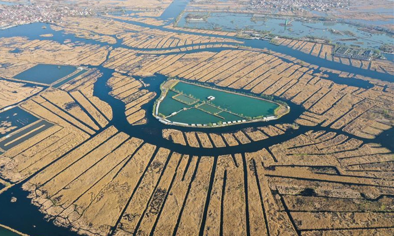 Aerial photo taken on April 1, 2019 shows the Baiyangdian Lake in Xiongan New Area in north China's Hebei Province. China will not relax its ecological and environmental protection in the next five years, Minister of Ecology and Environment Huang Runqiu said on the sidelines of the annual session of the national legislature. Ecological and environmental protection goals set for the 13th five-year plan period (2016-2020) are being accomplished in a smooth manner, Huang said, adding that seven of nine binding targets set for evaluating the protection work have been achieved, such as the emission control of major pollutants. According to an earlier report on environmental protection, the share of good air quality days in China's 337 cities at or above the prefecture level hit 82 percent in 2019, with 157 cities nationwide meeting the air quality standards. Improvement was also seen in nationwide rivers and lakes. The proportion of major rivers with a good water quality increased by 4.8 percentage points in 2019. Regarding lucid waters and lush mountains as invaluable assets, China has made new progress in advancing afforestation in recent years. Its forest coverage rate grew from about 8 percent in the early days of the People's Republic of China to nearly 23 percent in 2019. (Xinhua/Wang Jianhua)