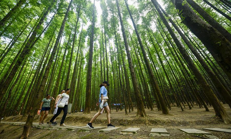 Tourists visit the Shanwangping Karst National Ecological Park in southwest China's Chongqing, Aug. 21, 2019. China will not relax its ecological and environmental protection in the next five years, Minister of Ecology and Environment Huang Runqiu said on the sidelines of the annual session of the national legislature. Ecological and environmental protection goals set for the 13th five-year plan period (2016-2020) are being accomplished in a smooth manner, Huang said, adding that seven of nine binding targets set for evaluating the protection work have been achieved, such as the emission control of major pollutants. According to an earlier report on environmental protection, the share of good air quality days in China's 337 cities at or above the prefecture level hit 82 percent in 2019, with 157 cities nationwide meeting the air quality standards. Improvement was also seen in nationwide rivers and lakes. The proportion of major rivers with a good water quality increased by 4.8 percentage points in 2019. Regarding lucid waters and lush mountains as invaluable assets, China has made new progress in advancing afforestation in recent years. Its forest coverage rate grew from about 8 percent in the early days of the People's Republic of China to nearly 23 percent in 2019. (Xinhua/Liu Chan)
