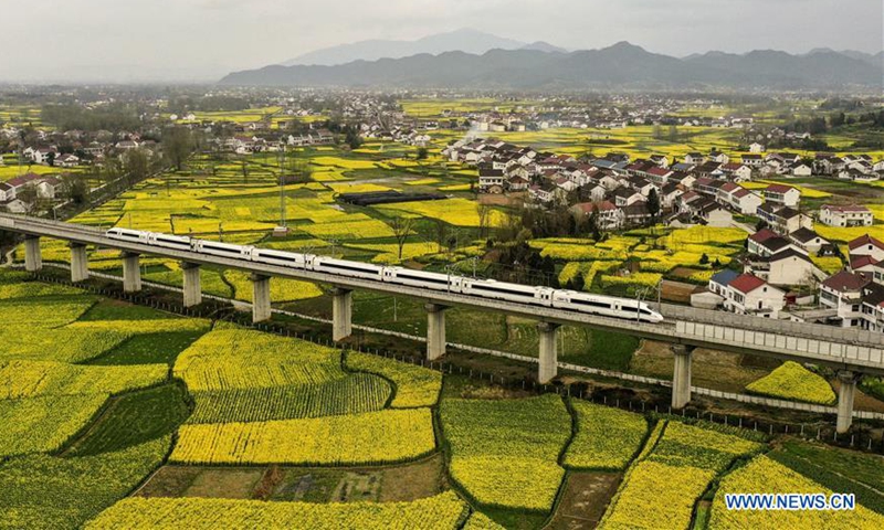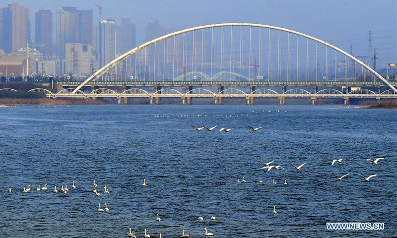 Photo taken on Feb. 20, 2019 shows scenery of the Swan Lake national urban wetland park in Sanmenxia City, central China's Henan Province. China will not relax its ecological and environmental protection in the next five years, Minister of Ecology and Environment Huang Runqiu said on the sidelines of the annual session of the national legislature. Ecological and environmental protection goals set for the 13th five-year plan period (2016-2020) are being accomplished in a smooth manner, Huang said, adding that seven of nine binding targets set for evaluating the protection work have been achieved, such as the emission control of major pollutants. According to an earlier report on environmental protection, the share of good air quality days in China's 337 cities at or above the prefecture level hit 82 percent in 2019, with 157 cities nationwide meeting the air quality standards. Improvement was also seen in nationwide rivers and lakes. The proportion of major rivers with a good water quality increased by 4.8 percentage points in 2019. Regarding lucid waters and lush mountains as invaluable assets, China has made new progress in advancing afforestation in recent years. Its forest coverage rate grew from about 8 percent in the early days of the People's Republic of China to nearly 23 percent in 2019. (Xinhua/Li Jianan)