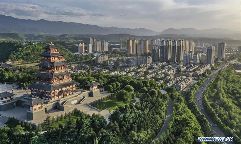 Aerial photo taken on May 22, 2019 shows the Shigu Pavilion in Baoji, northwest China's Shaanxi Province. China will not relax its ecological and environmental protection in the next five years, Minister of Ecology and Environment Huang Runqiu said on the sidelines of the annual session of the national legislature. Ecological and environmental protection goals set for the 13th five-year plan period (2016-2020) are being accomplished in a smooth manner, Huang said, adding that seven of nine binding targets set for evaluating the protection work have been achieved, such as the emission control of major pollutants. According to an earlier report on environmental protection, the share of good air quality days in China's 337 cities at or above the prefecture level hit 82 percent in 2019, with 157 cities nationwide meeting the air quality standards. Improvement was also seen in nationwide rivers and lakes. The proportion of major rivers with a good water quality increased by 4.8 percentage points in 2019. Regarding lucid waters and lush mountains as invaluable assets, China has made new progress in advancing afforestation in recent years. Its forest coverage rate grew from about 8 percent in the early days of the People's Republic of China to nearly 23 percent in 2019. (Xinhua/Tao Ming)