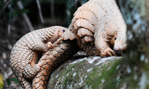 File photo shows a baby Sunda pangolin and its mother. Photo: Xinhua