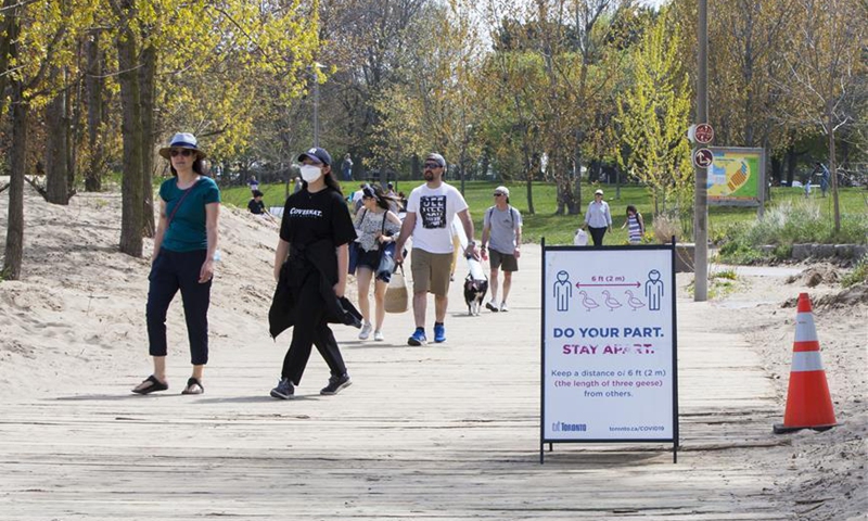 People walk along a trail at Woodbine Beach Park in Toronto, Canada, on May 23, 2020. The City of Toronto reopened hundreds of park amenities, including basketball courts, baseball diamonds and picnic pavilions, with physical distancing measures this weekend. (Photo by Zou Zheng/Xinhua)