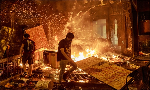 People hold signs and protest during a rally after a Minneapolis Police Department officer allegedly killed George Floyd on Tuesday in Minneapolis, Minnesota. A video of a handcuffed black man dying while a Minneapolis officer knelt on his neck for more than five minutes sparked fresh furor in the US over police treatment of African Americans. Photo: AFP