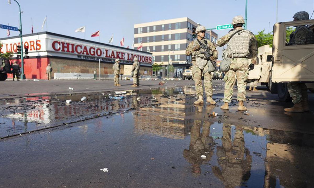 Minnesota National Guard troops stand watch on Lake Street in Minneapolis, Minnesota, the United States, May 30, 2020. Minnesota Governor Tim Walz on Saturday activated "full mobilization" of the Minnesota National Guard after four straight nights of violent protests in the midwest state's biggest city Minneapolis over the death of George Floyd, an unarmed black man, in police custody. (Photo by Ben Hovland/Xinhua)