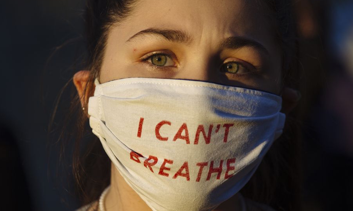 A protestor wears a face mask emblazoned with "I Can't Breathe" outside the 5th Police Precinct in Minneapolis, the United States, on May 30, 2020. (Photo by Angus Alexander/Xinhua)