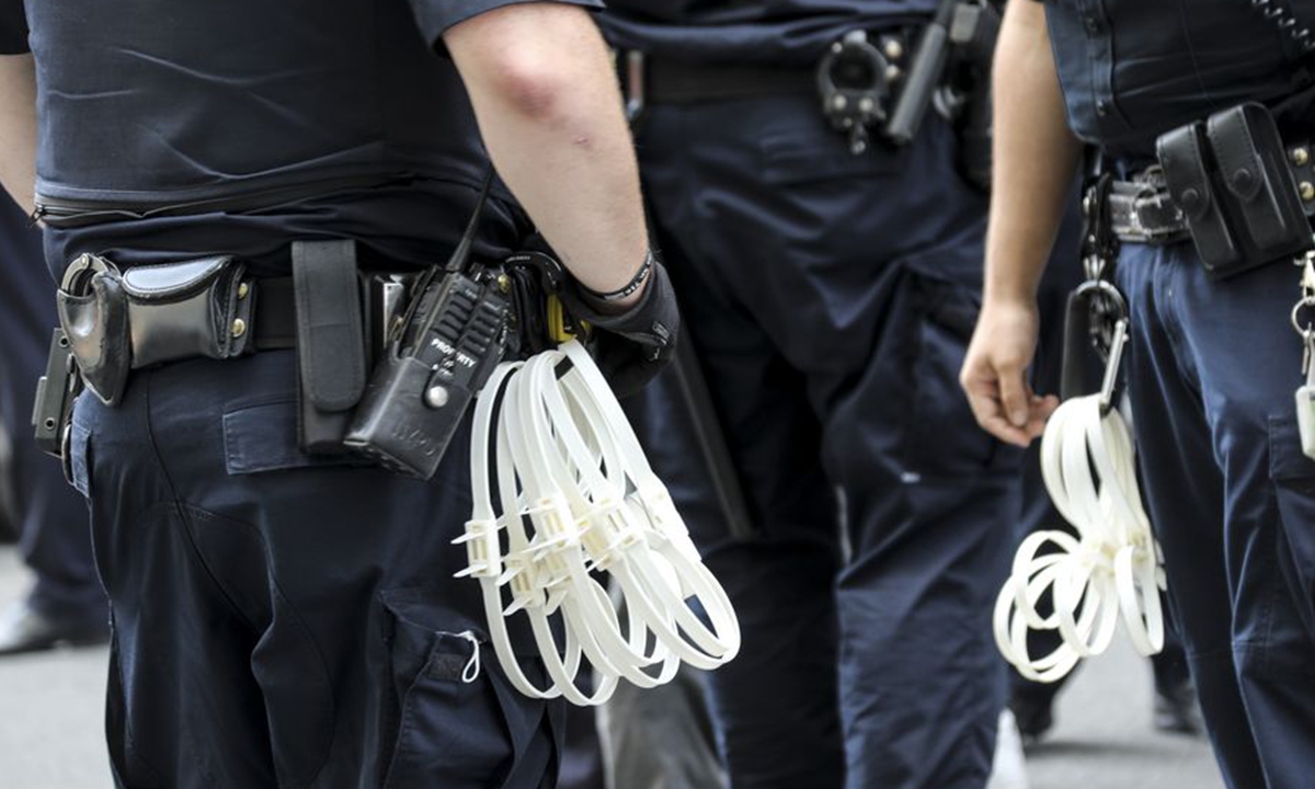 Zip ties are seen on police officers on a street of lower Manhattan near Foley Square in New York, the United States, May 29, 2020. (Xinhua/Wang Ying)