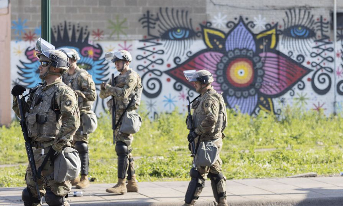 Minnesota National Guard troops stand watch on Lake Street in Minneapolis, Minnesota, the United States, May 30, 2020. (Photo by Ben Hovland/Xinhua)