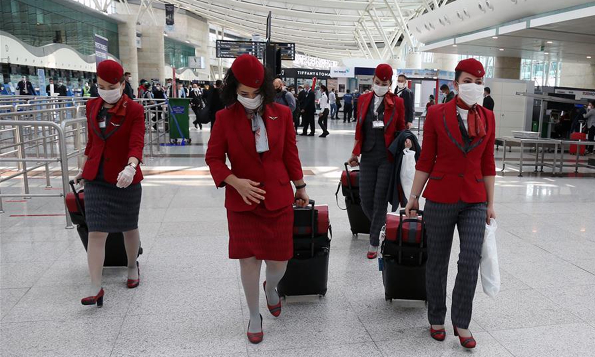 Flight crew wearing face masks are seen at Ankara Esenboga Airport in Ankara, Turkey, on June 1, 2020. Turkey's airline companies resumed their domestic operations on Monday with a limited number of flights. (Photo by Mustafa Kaya/Xinhua)