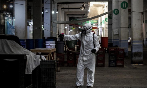 A worker disinfects a market which was closed due to COVID-19 in Mexico City, Mexico, on May 7. Photo: Xinhua