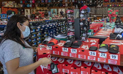 A customer shops in a Shoe City store on May 27 as Los Angeles County, California retailers reopen amid the continuing COVID-19 pandemic. The latest guidelines allow the resumption of in-store shopping at low-risk retail stores.Photo: AFP