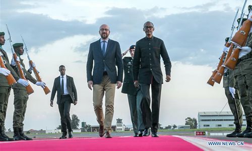 Rwandan President Paul Kagame (C-R) receives Belgian Prime Minister Charles Michel (C-L) in Kigali, capital of Rwanda, on April 6, 2019. Michel arrived in Kigali for the commemoration of the 25th anniversary of the 1994 Rwandan genocide. (Photo:Xinhua)