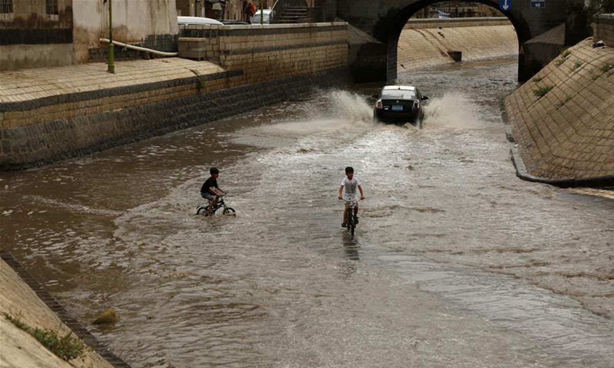 Children ride their bicycles through a flooded street following heavy rain in Sanaa, Yemen, on June 4, 2020. (Photo by Mohammed Mohammed/Xinhua)