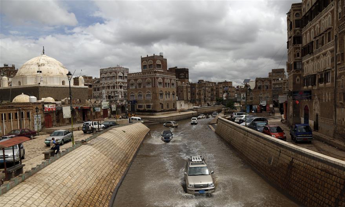 Cars drive through a flooded street following heavy rain in Sanaa, Yemen, on June 4, 2020. (Photo by Mohammed Mohammed/Xinhua)