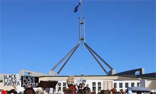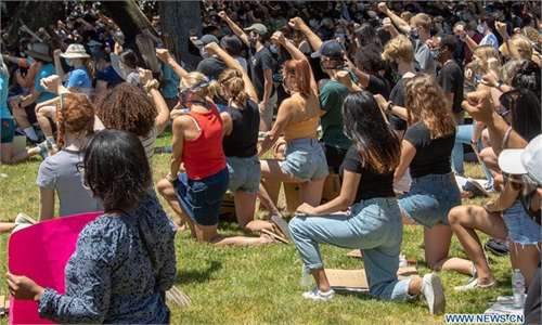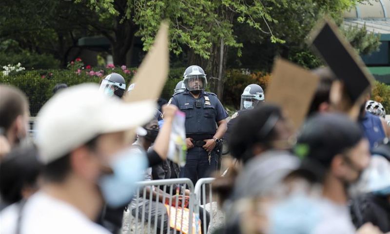 Police officers monitor a protest over the death of George Floyd in New York, the United States, June 2, 2020. New York City will be under a curfew from 8 p.m. to 5 a.m. the next morning till Sunday to curb criminal acts emerging from protests over the death of black man George Floyd, Mayor Bill de Blasio said on Tuesday. Photo: Xinhua