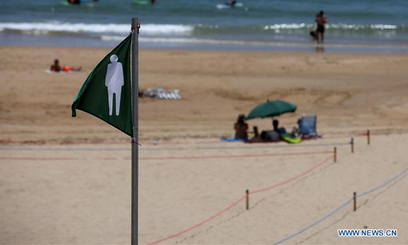 A green flag indicating little beach occupation is seen at the Carcavelos beach in Lisbon, Portugal, June 6, 2020. Portuguese President Marcelo Rebelo de Sousa and Prime Minister Antonio Costa on Saturday asked Portuguese to "go out safely" and enjoy the swimming season, despite this week's COVID-19 outbreaks in Greater Lisbon, local media reported. (Photo by Petro Fiuza/Xinhua)