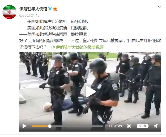 In response, the Iranian embassy said that US solution to the economic crisis was to print money like crazy, its solution to the COVID-19 epidemic was to pass the buck and withdraw from global organizations, and its solution to racial issues was to kneel on the neck. A video was also attached to the post of two police officers shoving a 75-year-old protester in New York City to the ground on Thursday.