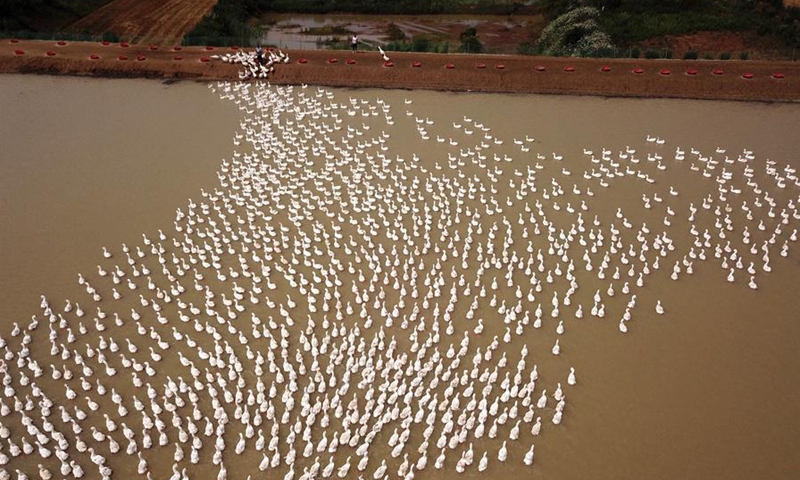 Aerial photo taken on June 6, 2020 shows Li Yong feeding white geese at a breeding base in Huangdian Village of Guanting Town in Feixi County, east China's Anhui Province. Li, a 38-year-old farmer, returned to his hometown, the Huangdian Village, and started the white goose breeding business in 2007 with the money he earned as a migrant worker for years. The breeding business has not only offered Li a way for accumulating a fortune, but also brought jobs and business opportunities to the fellow villagers. With the support from local authorities, Li took the lead to turn the breeding business into an industry for poverty alleviation via providing gratis goslings and breeding instructions to poor villagers, which has helped over 400 impoverished households get rid of poverty so far. (Xinhua/Liu Junxi)