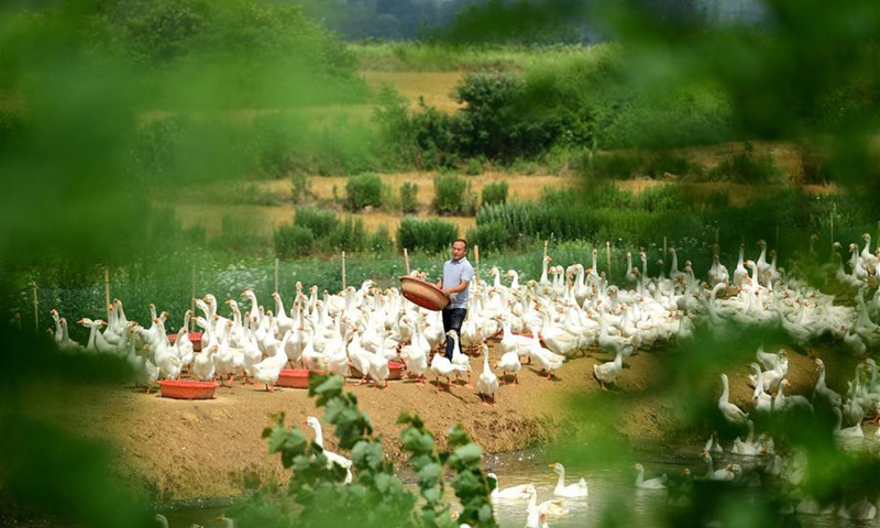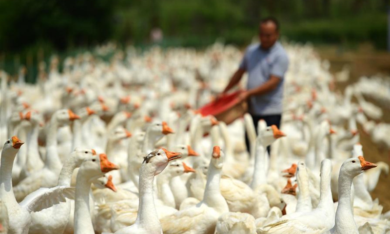 Li Yong feeds white geese at a breeding base in Huangdian Village of Guanting Town in Feixi County, east China's Anhui Province, June 6, 2020. Li, a 38-year-old farmer, returned to his hometown, the Huangdian Village, and started the white goose breeding business in 2007 with the money he earned as a migrant worker for years. The breeding business has not only offered Li a way for accumulating a fortune, but also brought jobs and business opportunities to the fellow villagers. With the support from local authorities, Li took the lead to turn the breeding business into an industry for poverty alleviation via providing gratis goslings and breeding instructions to poor villagers, which has helped over 400 impoverished households get rid of poverty so far. (Xinhua/Liu Junxi)