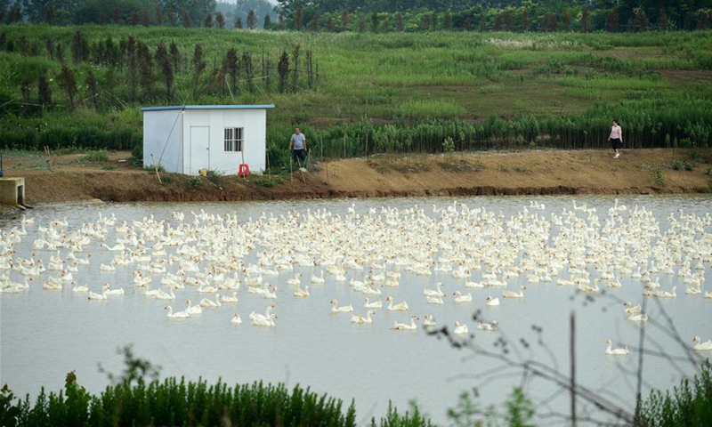 Li Yong (L) and his wife inspect a white goose breeding base in Huangdian Village of Guanting Town in Feixi County, east China's Anhui Province, June 6, 2020. Li, a 38-year-old farmer, returned to his hometown, the Huangdian Village, and started the white goose breeding business in 2007 with the money he earned as a migrant worker for years. The breeding business has not only offered Li a way for accumulating a fortune, but also brought jobs and business opportunities to the fellow villagers. With the support from local authorities, Li took the lead to turn the breeding business into an industry for poverty alleviation via providing gratis goslings and breeding instructions to poor villagers, which has helped over 400 impoverished households get rid of poverty so far. (Xinhua/Liu Junxi)