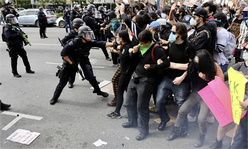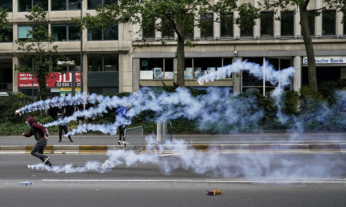 Protesters clash with riot police during an anti-racism protest in Brussels, Belgium on Sunday, as part of a weekend of "Black Lives Matter" worldwide protests over the death of George Floyd, an unarmed African American man killed by a white police in Minneapolis in the US. Photo: AFP