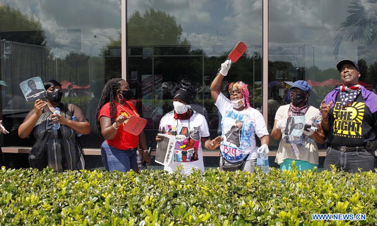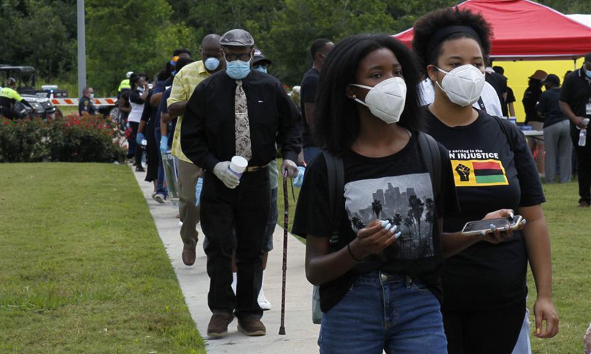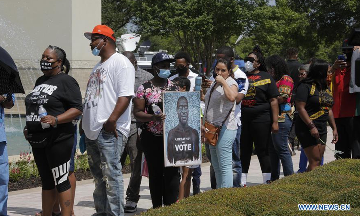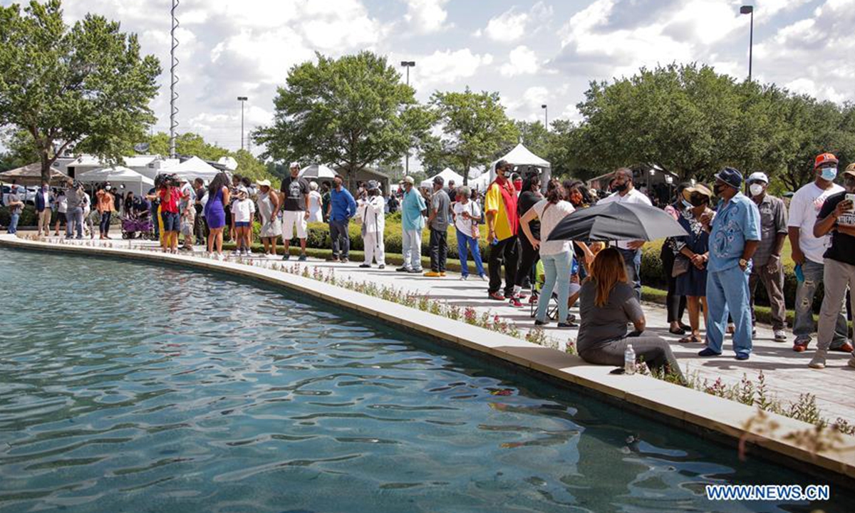 People wait to attend the public viewing for George Floyd in Houston, Texas, the United States, June 8, 2020. A public viewing for George Floyd, an African American man who died while in police custody, is underway on Monday in Houston, Texas, the United States. (Photo by Steven Song/Xinhua)