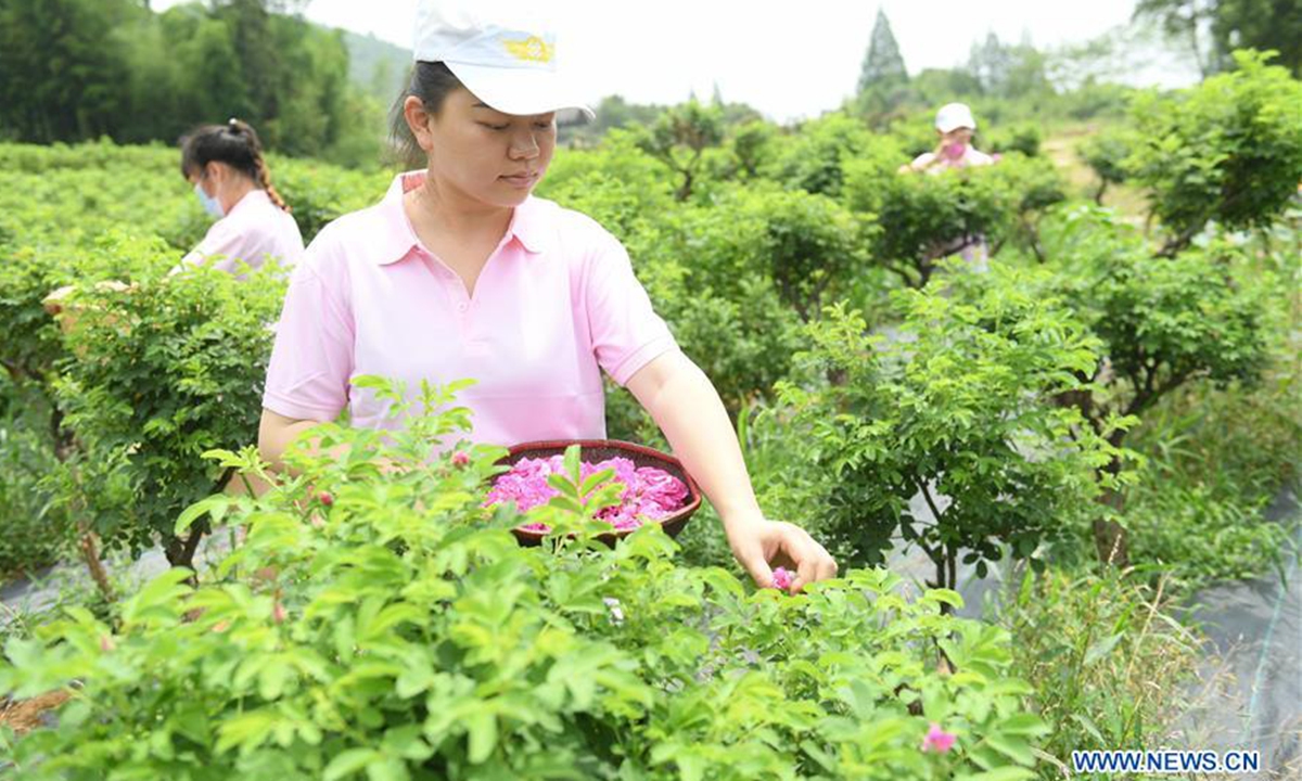 Members of staff pick roses at a rose garden in Daixi Town, Wuxing District of Huzhou, east China's Zhejiang Province, June 9, 2020. Daixi Town has been developing the cosmetics industry since 2015, and is now home to 103 companies that cultivate raw materials, manufacture products and develop tourism. (Xinhua/Weng Xinyang)