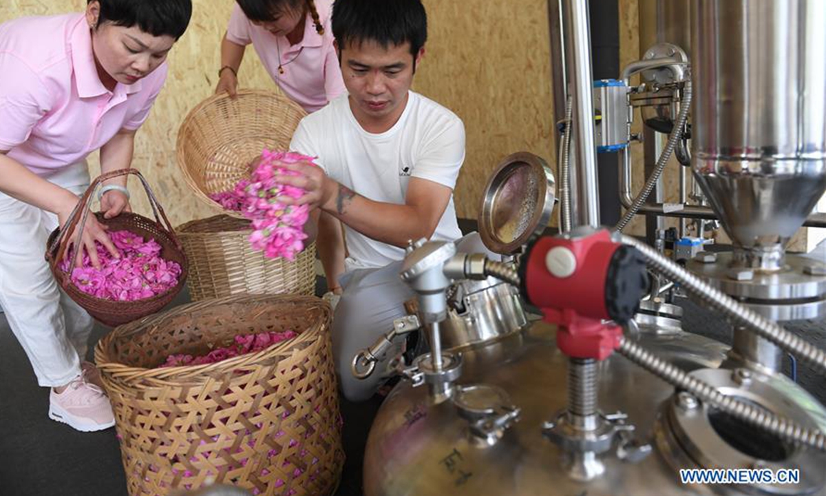 Members of staff extract essential oil from roses in Daixi Town, Wuxing District of Huzhou, east China's Zhejiang Province, June 9, 2020. Daixi Town has been developing the cosmetics industry since 2015, and is now home to 103 companies that cultivate raw materials, manufacture products and develop tourism. (Xinhua/Weng Xinyang)