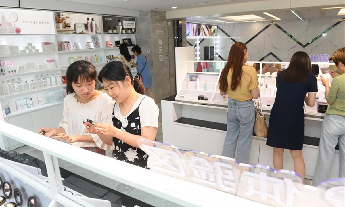 Customers try out cosmetics in Daixi Town, Wuxing District of Huzhou, east China's Zhejiang Province, June 9, 2020. Daixi Town has been developing the cosmetics industry since 2015, and is now home to 103 companies that cultivate raw materials, manufacture products and develop tourism. (Xinhua/Weng Xinyang)