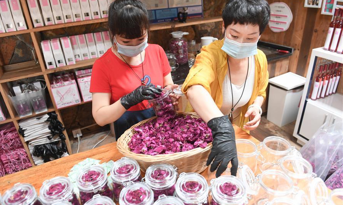 Members of staff package rose petals in Daixi Town, Wuxing District of Huzhou, east China's Zhejiang Province, June 9, 2020. Daixi Town has been developing the cosmetics industry since 2015, and is now home to 103 companies that cultivate raw materials, manufacture products and develop tourism. (Xinhua/Weng Xinyang)