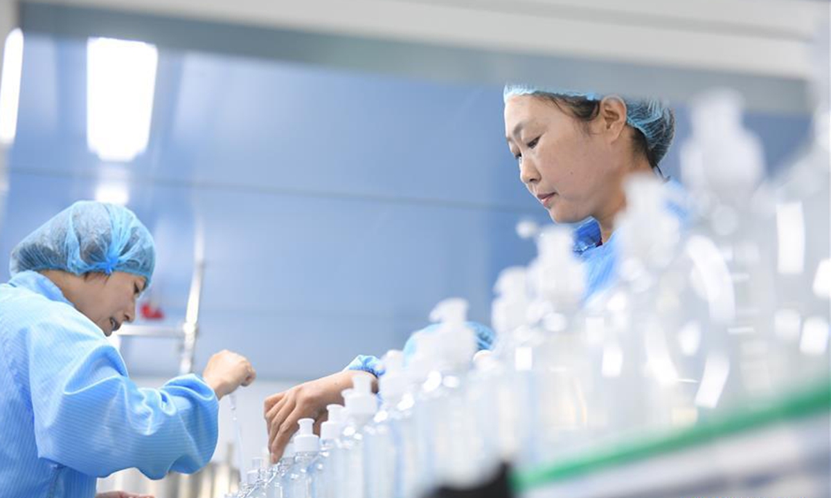 Members of staff work on the production line of a cosmetics company in Daixi Town, Wuxing District of Huzhou, east China's Zhejiang Province, June 9, 2020. Daixi Town has been developing the cosmetics industry since 2015, and is now home to 103 companies that cultivate raw materials, manufacture products and develop tourism. (Xinhua/Weng Xinyang)