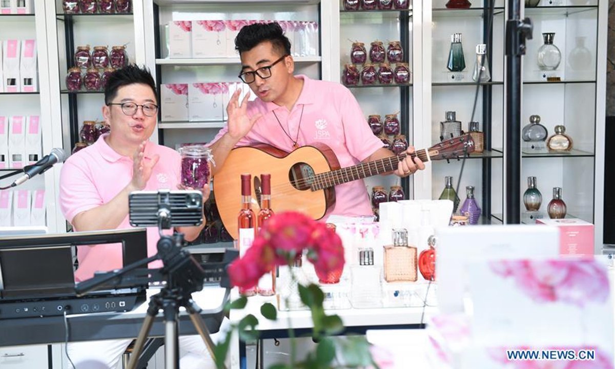 Members of staff promote cosmetics through livestreaming in Daixi Town, Wuxing District of Huzhou, east China's Zhejiang Province, June 9, 2020. Daixi Town has been developing the cosmetics industry since 2015, and is now home to 103 companies that cultivate raw materials, manufacture products and develop tourism. (Xinhua/Weng Xinyang)