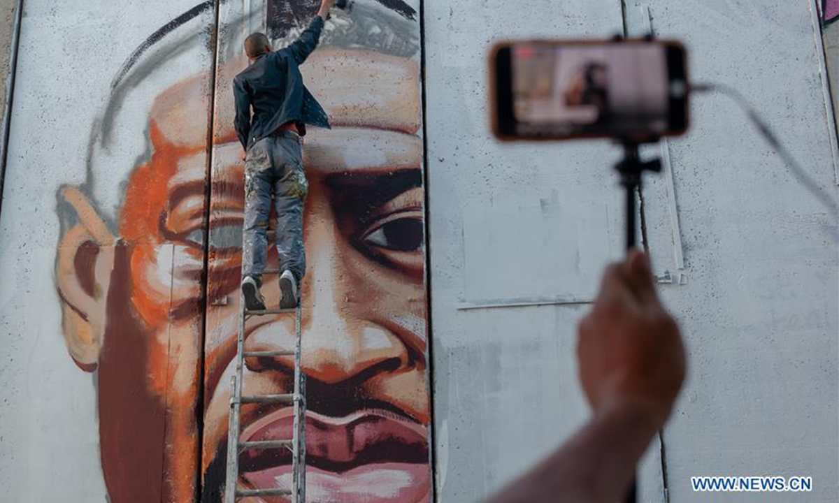 Palestinian artist Taqi Spateen paints a mural of George Floyd on the Israeli separation wall in the West Bank city of Bethlehem, June 9, 2020. (Photo by Luay Sababa/Xinhua)