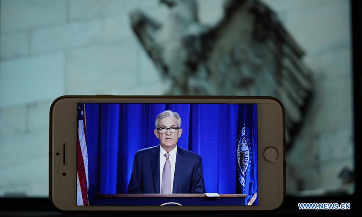 Photo taken on June 10, 2020 shows the live broadcast of U.S. Federal Reserve Chairman Jerome Powell's address during a press conference in Washington D.C., the United States. The U.S. Federal Reserve on Wednesday kept its benchmark interest rate unchanged at the record-low level of near zero amid mounting fallout from the COVID-19-induced recession, and projected interest rates to remain at the current level through at least 2022. (Xinhua/Liu Jie)