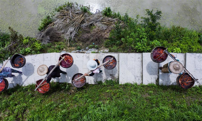 Farmers carrying wood bowls filled with fish fry prepare to put them into the fields in Xiaozhoushan Township, Qingtian County of east China's Zhejiang Province, June 11, 2020. Farmers started ploughing for transplanting rice seedlings in terraced fields in Xiaozhoushan Township after the planted rape are harvested in June. (Xinhua/Xu Yu)