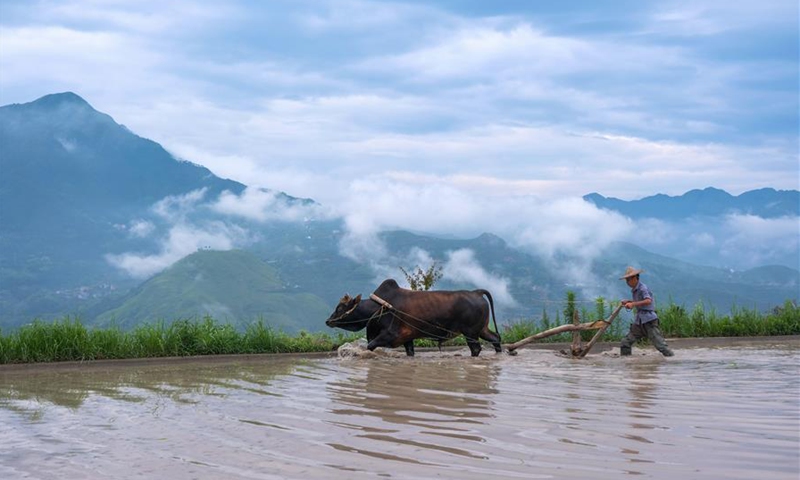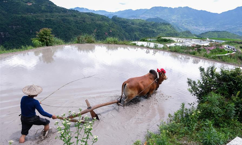 A farmer ploughs the field in the help of a buffalo in Xiaozhoushan Township, Qingtian County of east China's Zhejiang Province, June 11, 2020. Farmers started ploughing for transplanting rice seedlings in terraced fields in Xiaozhoushan Township after the planted rape are harvested in June. (Xinhua/Xu Yu)