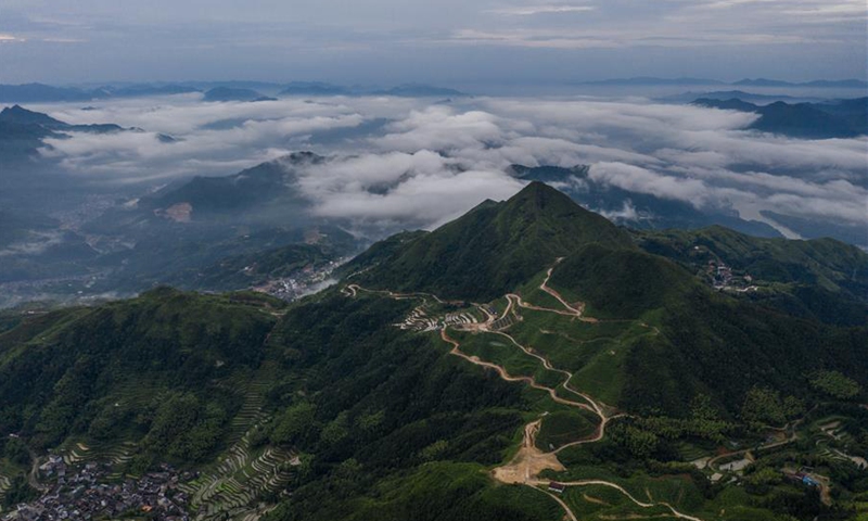 The Xiaozhoushan Township is seen in clouds and mountains in Qingtian County of east China's Zhejiang Province, June 11, 2020. Farmers started ploughing for transplanting rice seedlings in terraced fields in Xiaozhoushan Township after the planted rape are harvested in June. (Xinhua/Xu Yu)