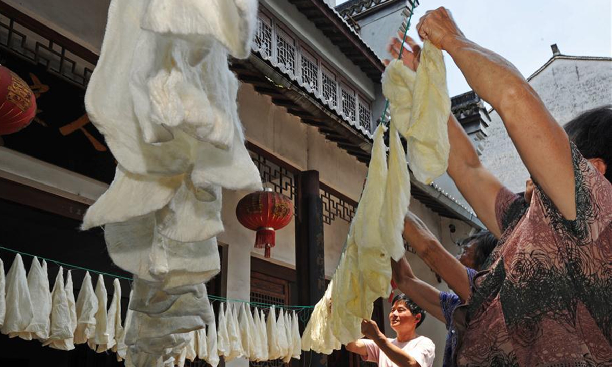 Wang Yishi (1st L) and villagers dry silk materials for making silk quilt at his Jili silk museum in Huzhou City, east China's Zhejiang Province, June 12, 2020. Jili silk, produced in Jili Village of Huzhou, is famous for its high quality. It was designated as the material to make ropes for Chinese emperors since the middle of the Ming Dynasty (1368-1644). In 2011, the making technique of the silk was listed as one of the national intangible cultural heritages. It is known worldwide since 1851 when Jili silk won the first gold prize for China during the World Expo. Wang Yishi, 63 years old, a farmer at the Jili Village, has been working on inheriting the making skills of Jili silk for many years. He takes care of his silkworm farm every day and also runs a museum for the craft. The museum was opened to the public for free in July of 2018, with 300 plus silk-related items on display. (Xinhua/Tan Jin)
