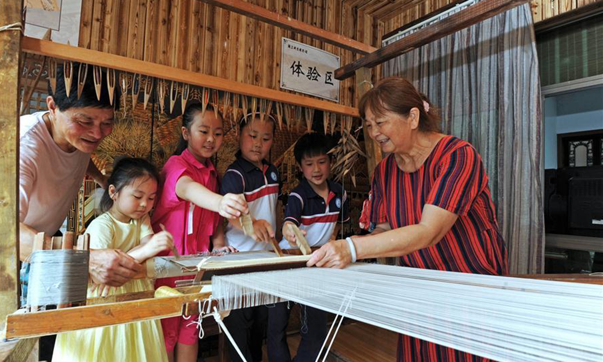 Wang Yishi (1st L) and his wife Ji Jinmei (1st R) introduces to children the technique of making silk at his Jili silk museum in Huzhou City, east China's Zhejiang Province, June 12, 2020. Jili silk, produced in Jili Village of Huzhou, is famous for its high quality. It was designated as the material to make ropes for Chinese emperors since the middle of the Ming Dynasty (1368-1644). In 2011, the making technique of the silk was listed as one of the national intangible cultural heritages. It is known worldwide since 1851 when Jili silk won the first gold prize for China during the World Expo. Wang Yishi, 63 years old, a farmer at the Jili Village, has been working on inheriting the making skills of Jili silk for many years. He takes care of his silkworm farm every day and also runs a museum for the craft. The museum was opened to the public for free in July of 2018, with 300 plus silk-related items on display. (Xinhua/Tan Jin)