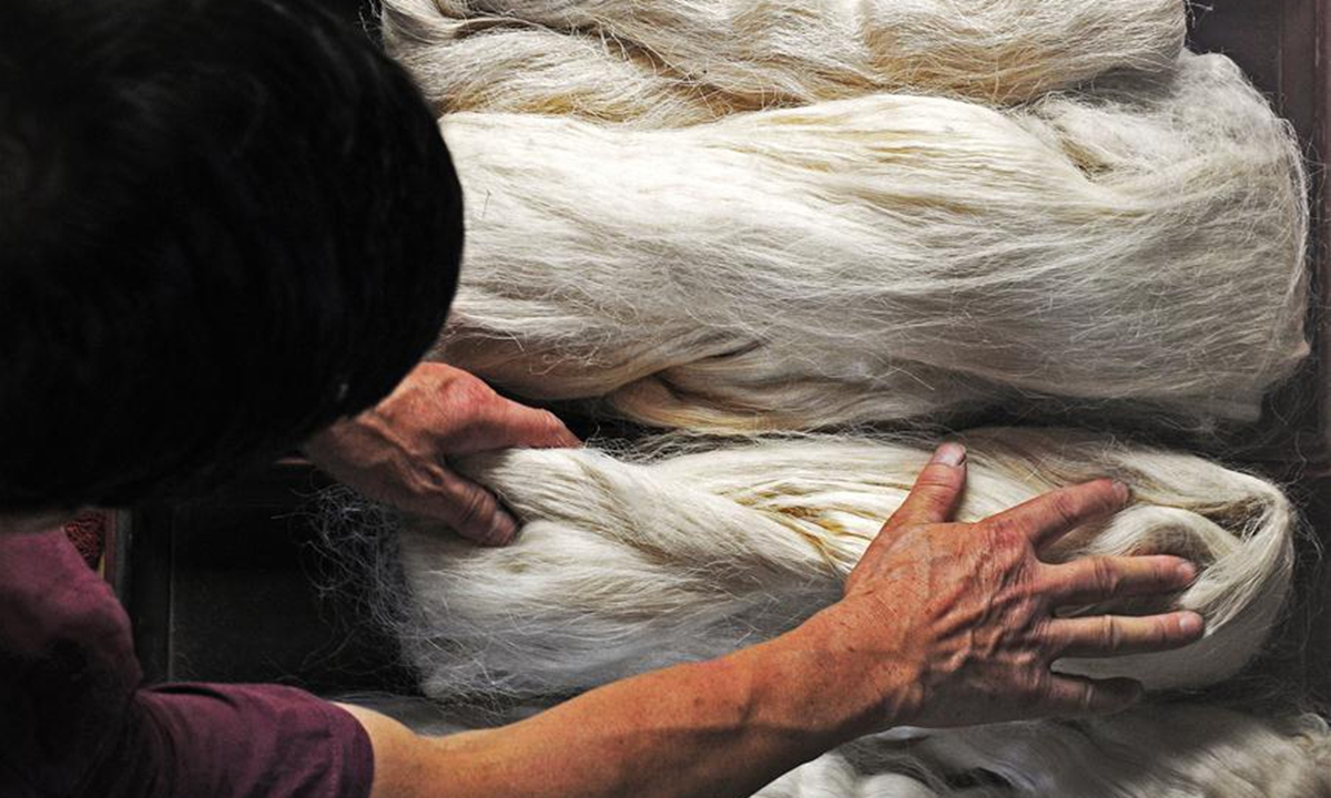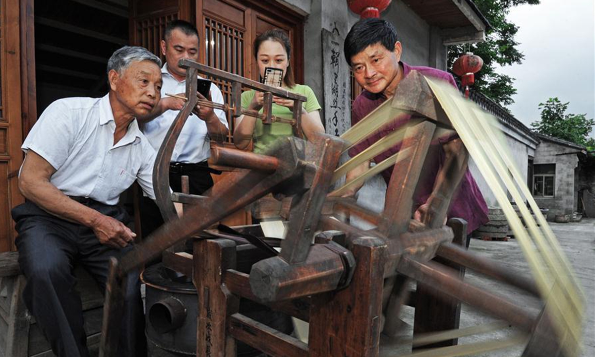 Wang Yishi (1st R) observes the silk making technique of inheritor Gu Mingqi (1st L) at his Jili silk museum in Huzhou City, east China's Zhejiang Province, June 11, 2020. Jili silk, produced in Jili Village of Huzhou, is famous for its high quality. It was designated as the material to make ropes for Chinese emperors since the middle of the Ming Dynasty (1368-1644). In 2011, the making technique of the silk was listed as one of the national intangible cultural heritages. It is known worldwide since 1851 when Jili silk won the first gold prize for China during the World Expo. Wang Yishi, 63 years old, a farmer at the Jili Village, has been working on inheriting the making skills of Jili silk for many years. He takes care of his silkworm farm every day and also runs a museum for the craft. The museum was opened to the public for free in July of 2018, with 300 plus silk-related items on display. (Xinhua/Tan Jin)