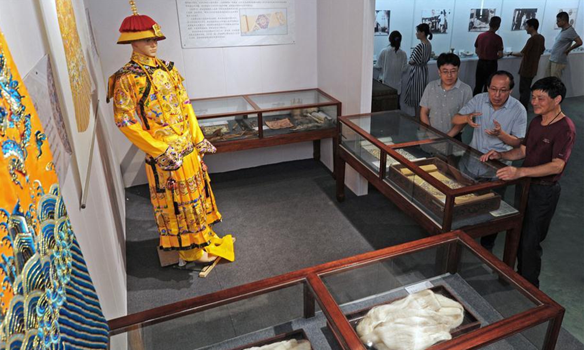 Wang Yishi (1st R) listens to the notice for keeping silk products at his Jili silk museum in Huzhou City, east China's Zhejiang Province, June 11, 2020. Jili silk, produced in Jili Village of Huzhou, is famous for its high quality. It was designated as the material to make ropes for Chinese emperors since the middle of the Ming Dynasty (1368-1644). In 2011, the making technique of the silk was listed as one of the national intangible cultural heritages. It is known worldwide since 1851 when Jili silk won the first gold prize for China during the World Expo. Wang Yishi, 63 years old, a farmer at the Jili Village, has been working on inheriting the making skills of Jili silk for many years. He takes care of his silkworm farm every day and also runs a museum for the craft. The museum was opened to the public for free in July of 2018, with 300 plus silk-related items on display. (Xinhua/Tan Jin)